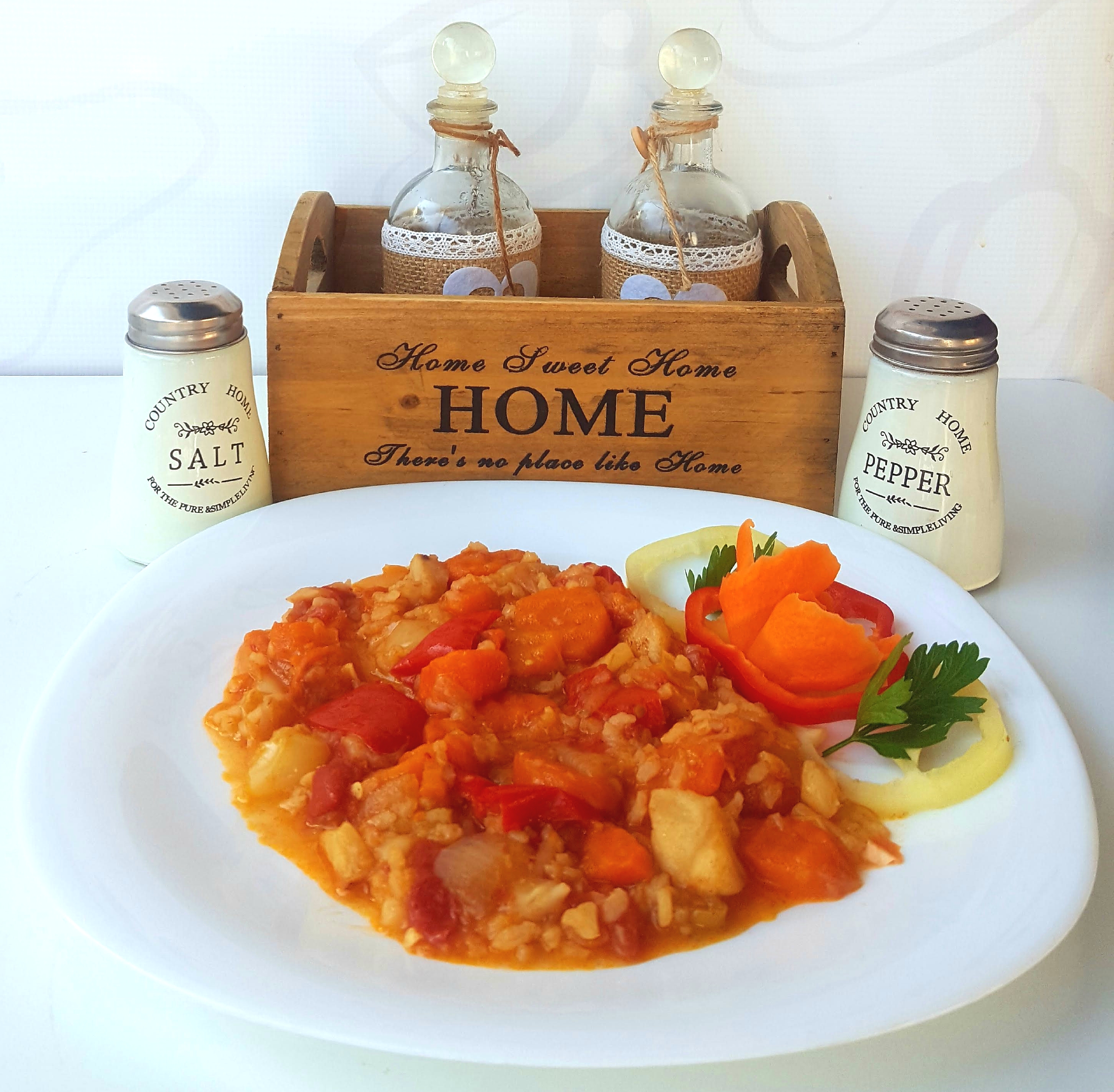 ![]() | Pui cu legume in sos dulce acrisor 260 g Carne de pui, ardei gras, ghimbir, morcov, dovlecei, ceapa, sos soia. | 21.50 lei | |